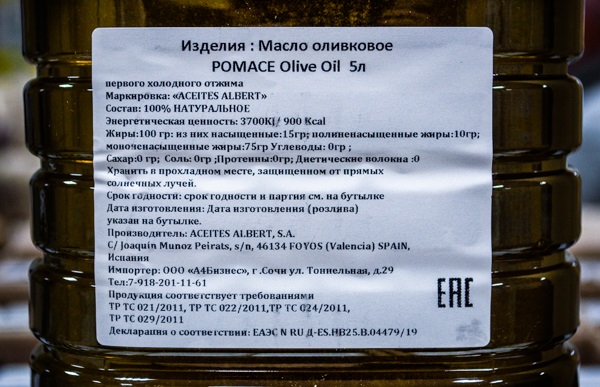 масло оливковое Casalbert «POMACE» 4 шт. по 5 л 5 760 Руб натуральное оливковое масло, рафинированное (1 440 Руб/шт)